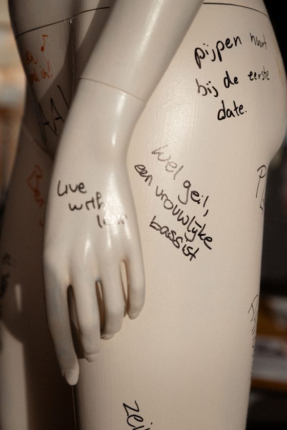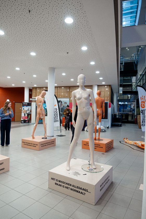 Dat is de introtekst bij de kunstinstallatie ‘Het is maar een grap’. Deze installatie laat verschillende – soms ogenschijnlijk onschuldige – vormen van geweld tegen vrouwen zien, en hoe die elkaar beïnvloeden of versterken. Als uitgangspunt heb ik de piramide van (gendergerelateerd) geweld gebruikt; elke pop die je in deze installatie ziet, verbeeldt één van de lagen.